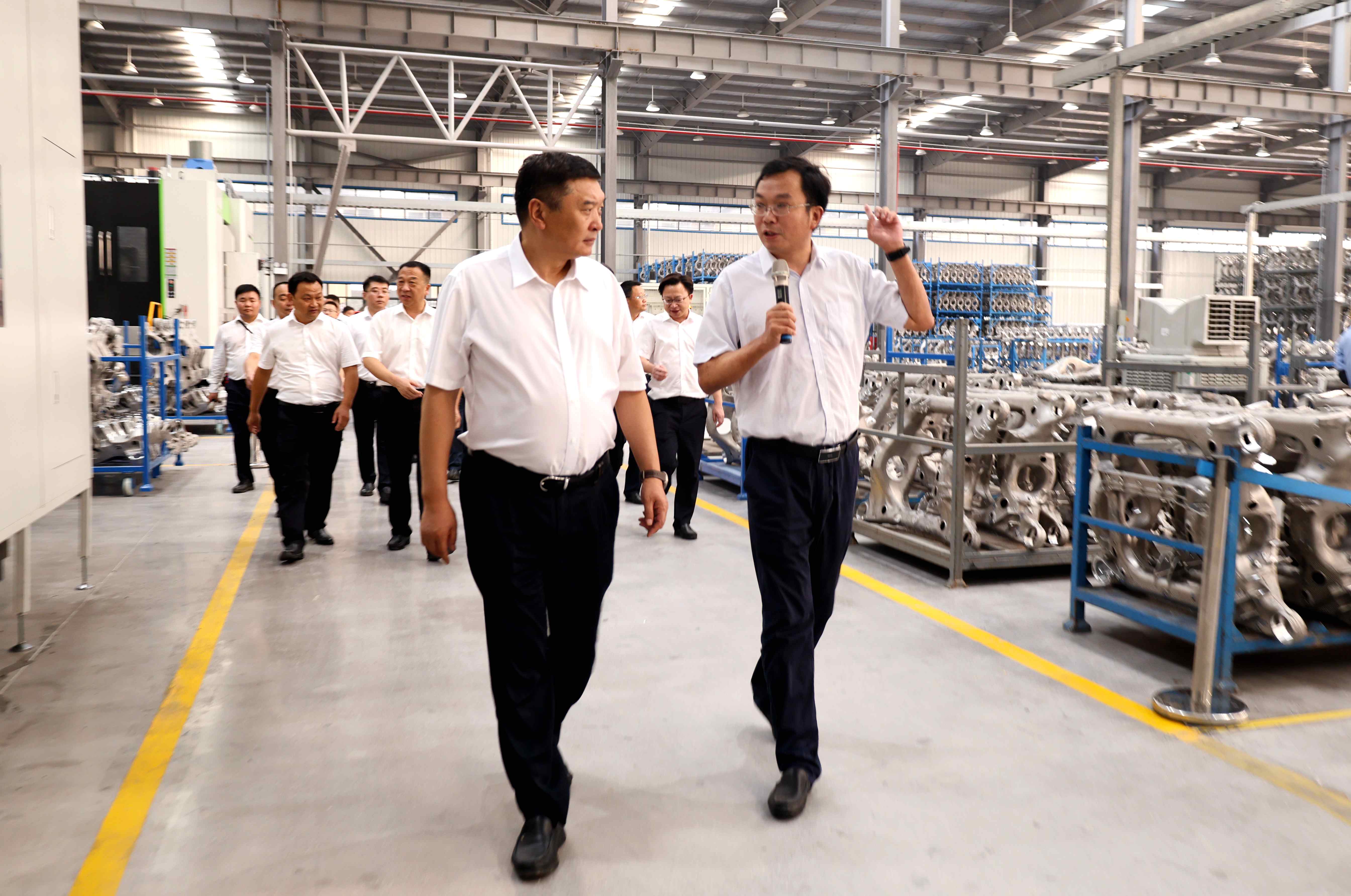 區(qū)政府包聯航特裝備單位負責人--掇刀區(qū)發(fā)改局局長王鵬程就航特新能源汽車輕量化副車架精密加工項目總體情況、產能規(guī)劃等內容作了詳細的說明。在精密加工車間內,公司副總經理熊小平向周俊杰及參加活動的各級領導介紹了項目建設情況、設備運行情況及當前市場形勢。周俊杰回顧了該項目從立項到實施建設的全部過程。